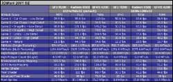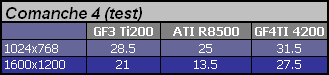 Pisałem już, że znalazłem dwa testy gdzie ATI ma potknięcie. Pierwszym z nich jest Comanche 4. Aby nie było nieporozumień: test a nie gra. Test daje nieco dziwaczne wyniki, bo trudno cokolwiek sensownego z nich wywnioskować albo odnieść do zachowania kart w realnej grze. Specjaliści - teoretycy twierdzą, że przy procesorze 3.5GHz wynik zobrazuje wydajność kart. Poczekam spokojnie na weryfikację tej tezy. Na razie intrygująca tabelka.