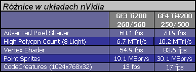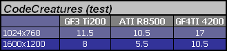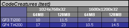 Dzięki temu, że miałem okazję porównania kilku kart w wersjach zarówno 64 jak i 128MB to naturalnym było sprawdzenie przydatności rozszerzonej pamięci. Niestety pomimo usilnych poszukiwań nie znalazłem gry, która robiłaby realną różnicę GeForce'om w tym względzie. Jeśli jakaś nowość używa bardzo dużych tekstur to są one kompresowane. Typowym przykładem jest MOHAA. Mamy wybór: kompresja i duże tekstury lub bez kompresji, ale za to małe. Nawet w 1600x1200x32 64MB wciąż wydaje się wystarczającą ilością. Osobiście nie mam jednak wątpliwości, że to się zmieni. Dla niedowiarków polecam rys historyczny i analizę związaną z przekraczaniem kolejnych barier ilościowych. Logicznym się z resztą wydaje, że dopiero wtedy jak znajdzie się na rynku odpowiednia baza w postaci znaczącego udziału kart 128MB producenci gier odważą się to wykorzystać. Zawsze ceną za bajery zawarte w najnowszych kartach opłacamy z góry programistów. Zanim GF3 i R8500 nie wgryzło się w rynek trudno było oczekiwać np. gier z shaderami a kupowaliśmy technologię "w ciemno" skuszeni ciasteczkiem wysokiego taktowania i super wynikami fps w grach gdzie w sumie ich nie potrzebowaliśmy. To naturalna kolejność. Postęp cywilizacyjny to sztuka wmówienia ludziom, że niezbędne jest im do życia to, co w zasadzie w ogóle nie jest potrzebne. Ale to tylko taka dywagacja. Chcemy postępu. Tak czy inaczej, jeśli ktoś kupuje karty graficzne niezbyt często to moim zdaniem sensowniejsze wydaje się dołożenie do wersji 128MB. Kropka. Dziś możemy się jedynie podbudować kosmetycznymi różnicami wyników testów (<10%) i to w trybach, które nie nadają się do gier z powodu braku płynności ruchu. Na osłodę futurystyczny rozbłysk w postaci CodeCreatures.