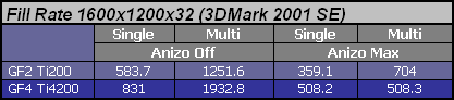 Ten przykład pokazuje jak dobrym posunięciem ATI było wprowadzenie metody wybiórczej. Obydwa GeForce'y "umierają" i jedynie co można próbować to zmniejszyć zdecydowanie jakość filtrowania do trybu 2x choć i tak jest to nieprzyjemnie odczuwalne przy tak wymagającej grze. Najważniejsze jest jednak to, że coś dziwnego dzieje się z GF4 bo w teście słabnie on zdecydowanie mocniej niż GF3. Niestety tu uwidocznia się jak dla mnie najważniejszy bug najnowszych kart nVidia. Włączając filtrowanie anizotropowe w D3D GeForce4 traci umiejętność równoczesnego przetwarzania kilku tekstur (multitexturing). Dobrze to obrazują wyniki testów Filrate z 3DMark 2001 SE.