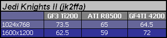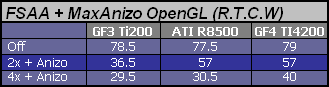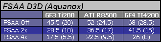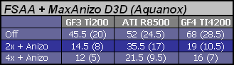 Temu wyzwaniu GF3 Ti200 nie jest w stanie sprostać i trzeba ograniczać jakość anizo przy FSAA 2x. Na GF4 można działać z maksymalnym filtem + antyaliasing 2x lub ograniczyć anizo ale dać FSAA 4x. Na Radeonie zmniejszanie jakości filtrowania anizotropowego nie ma zupełnie sensu ale i wychodzenia z antyaliasingiem powyżej 2x w tej grze również.