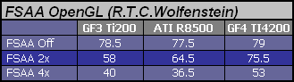 Wyniki nie budzę wątpliwości. GF4 odstawia konkurencję na boczny tor. Radeon próbuje jeszcze walczyć z GF4 w trybie 2x, ale przy 4x sprowadzony zostaje do poziomu znacznie niżej taktowanego GF3. W tej grze supersampling 4x jest dobry do poziomu 800x600x32. Powyżej następuje agonia układu ATI.