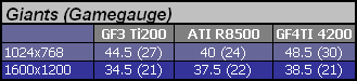 Nie musiałem nawet podawać Fill Rate czy teoretycznej przepustowości pamięci, bo układ czterech strumieni renderowania wyposażonych w dwie jednostki teksturujące każdy (4x2) oraz pamięci DDR na szynie 128-bitów są wspólne, więc wystarczy sobie wyprowadzić odpowiednie wartości z taktowania. Biorąc je po uwagę to karta ATI powinna być teoretycznie najsilniejsza w tej grupie. Wcześniejsze testy wykazały, że w realnym świecie gier wyniki, jakie osiąga Radeon można raczej porównać z GF3, który jest przecież taktowany niżej, więc nic nie można przesądzić na tym etapie rozważań.
