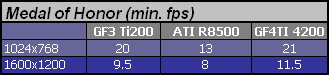 Teraz coś bardziej interesującego. Medal of Honor Allied Assault. Piękne tekstury wysokiej rozdzielczości i spore wymagania w niektórych układach. Niemal całą grę karty przechodzą w 1024x768x32 na poziomie 50 fps. Problem występuje w układzie z bunkrami w lesie przy padającym śniegu. Obraz śliczny, ale przy jednoczesnym ostrzale można się poczuć jak po zanurzeniu po pas w błocie. Co ważniejsze oba GeForce'y wyraźnie lepiej sobie z tym radzą i jako, że wcześniej GF3 miał również więcej problemów w tym miejscu to należy pochwalić nVidia za znaczące poprawienie sterowników. Moja unikalna metoda pomiarowa polega na określeniu minimalnego poziomu chwilowych fps w konkretnym miejscu tego feralnego układu. Tabelka wyglada następująco.