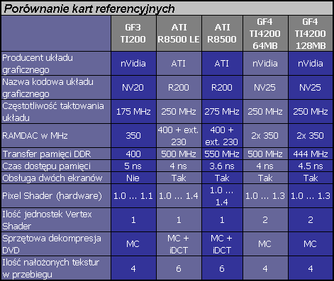 GeForce4Ti 4200 i okolice, czyli trudna sztuka wyboruPo raz kolejny zakotłowało się na rynku i w naszych konsumenckich głowach. W cennikach pojawiły się długo oczekiwane karty GF4Ti 4200, Radeony 8500 staniały i poszerzyły swoją ofertę a GF3Ti200 wyprzedawane są w cenach, które jeszcze niedawno byłyby nie do pomyślenia i co ważne są wciąż dostępne. Za kwoty zaczynające się od ok. 600 zł możemy zostać szczęśliwymi posiadaczami kart obsługujących sprzętowo Dx8 (Pixel Shader) a w przedziale do 1000 zł mamy już naprawdę niezły wybór. Aby nieco zmniejszyć rozterki osiołka przy żłobie spróbuję rzucić na ten temat nieco więcej światła. Nie będzie to "uczta numerologa". Karty testowane były w pececie, który na co dzień służy mi głównie do przeglądania poczty. Jeden system, procesor taktowany niewiele ponad 1GHz, pojedynczy pakiet oficjalnych sterowników referencyjnych, ograniczony zestaw wyników testów dobranych tak, aby odpowiedzieć na konkretne pytania a nie być celem samym dla siebie. Natomiast postaram się postawić te podstawowe pytania i spróbować odpowiedzieć na nie wprost lub opisać zagadnienie tak, aby łatwiej było samemu znaleźć na nie odpowiedź w zależności od subiektywnych preferencji. Chciałbym, aby ten artykuł wykraczał nieco poza ramy typowego testu. W założeniach ma on również pomóc w określeniu własnych wymagań w stosunku do wymarzonej karty graficznej. Stąd obecność dodatkowego rozdziału niezwiązanego z testowanymi kartami, który napisałem z myślą o mniej zorientowanych w zagadnieniu doboru karty użytkownikach. Starzy wyjadacze sprzętowi powinni go po prostu ominąć. W związku z objętością samego artykułu oraz ograniczeniem czasu, jaki mogę poświęcić na jego napisanie został on podzielony na dwie części.