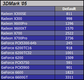W tej recenzji postanowiłem miłośnikom benchmarkowania zrobić dodatkowy prezent i porównać "Ucztę numerologa" z 3DMark 2005. Wyniki poszczególnych kart przedstawiają się następująco.