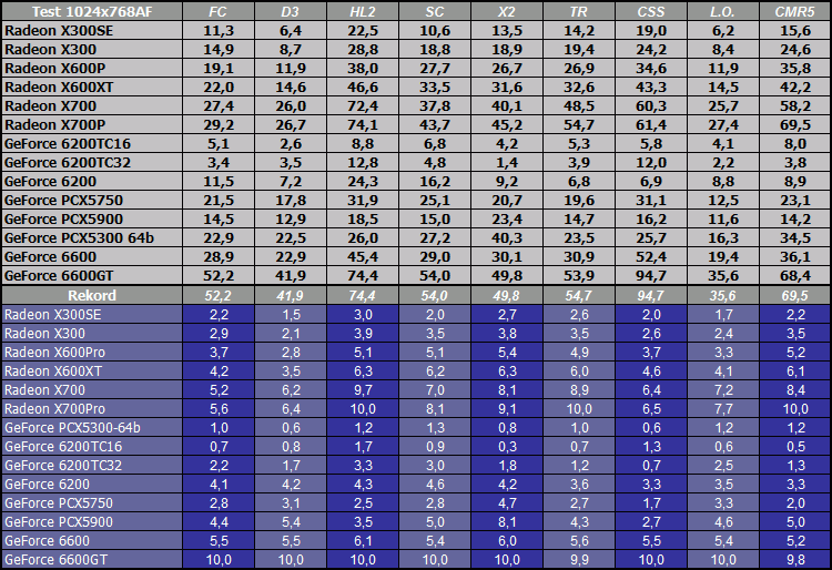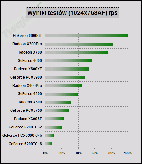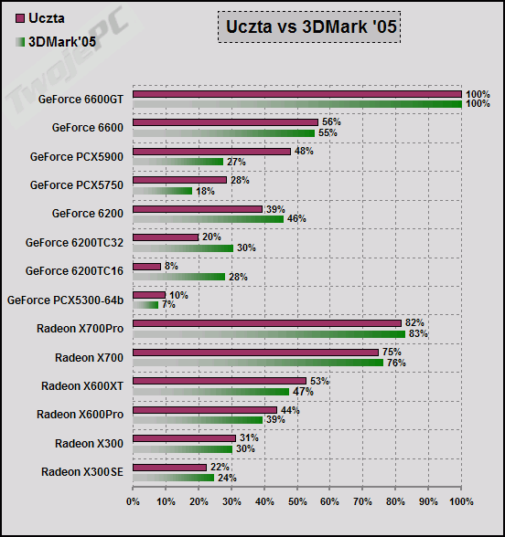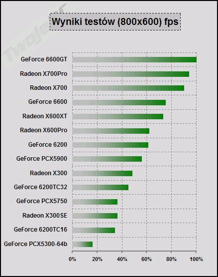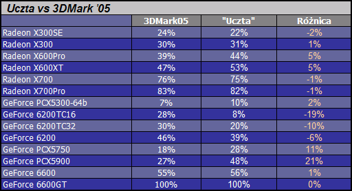 W ten sposób udało się określić kolejność kart w zależności od osiągniętych wyników testów wraz z procentową różnicą pomiędzy nimi. Porównanie kart do 1000 zł bez cienia wątpliwości wygrał GeForce 6600GT osiągając przewagę niemal 20% nad kartą Radeon X700Pro. Trzeci jest Radeon X700 którego różnica do wersji Pro jest niewielka. Potem następuje kolejna większa "przerwa", po której mamy cały szereg kart różniących się pomiędzy sobą o ok. 5%. Listę rozpoczyna GeForce 6600 osiągając 56% wysokości wyników lidera, a kończy GeForce 6200TC32 wartością 20%. Z zestawu wyróżniają się negatywnie GeForce PCX5300-64b oraz GeForce 6200TC16.