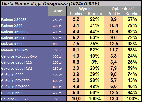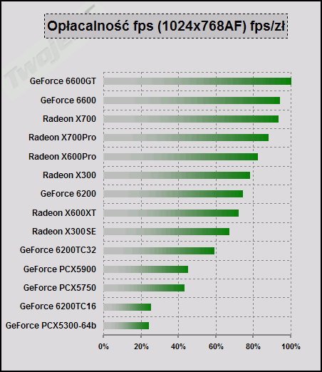 Największą "opłacalnością" wykazała się karta GeForce 6600GT. Na drugim miejscu GeForce 6600 oraz Radeon X700. W swoich kategoriach cenowych są to najciekawsze propozycje. Najsłabiej w tym porównaniu wypadają natomiast karty serii PCX oraz TurboCache 16MB. Ich cena jest zdecydowanie za wysoka w stosunku do możliwości osiągania konkretnych wyników testów.