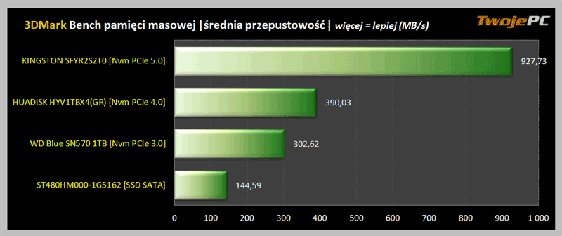 Test wydajności dysków SSD dla graczy. Benchmark pamięci masowej 3DMark jest testem przygotowanym specjalnie do pomiaru wydajności pamięci masowej w grach. Wykorzystując ślady zarejestrowane w prawdziwych grach, testuje wydajność takich czynności jak ładowanie gier, zapisywanie postępów, instalowanie plików gier i nagrywanie strumieni wideo z rozgrywki. Podany wynik na wykresie to średnia ze wszystkich testów.