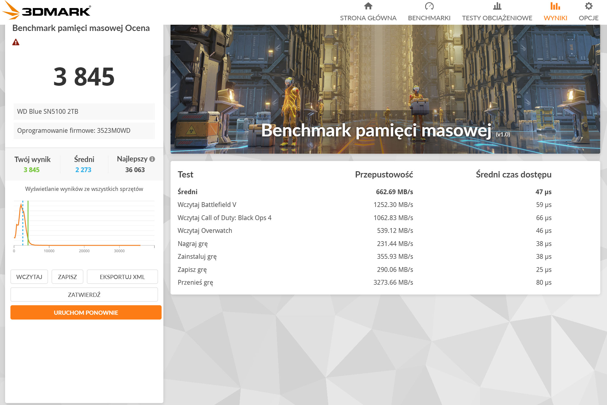 Test wydajności dysków SSD dla graczy. Benchmark pamięci masowej 3DMark jest testem przygotowanym specjalnie do pomiaru wydajności pamięci masowej w grach. Wykorzystując ślady zarejestrowane w prawdziwych grach, testuje wydajność takich czynności jak ładowanie gier, zapisywanie postępów, instalowanie plików gier i nagrywanie strumieni wideo z rozgrywki. Podany wynik na wykresie to średnia ze wszystkich testów.