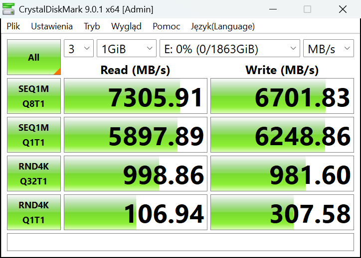 SEQ1M Q1T1 – sekwencyjny odczyt/zapis, blok 1 MB, 1 kolejka, 1 wątek.