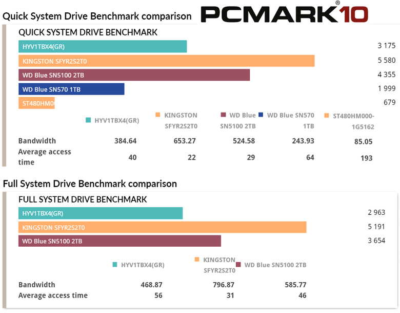 - PCMark10 Full System Drive Benchmark - testuje dysk w pełnym scenariuszu systemowym, symulując realne obciążenia komputera. Obejmuje odczyt i zapis w różnorodnych zastosowaniach: